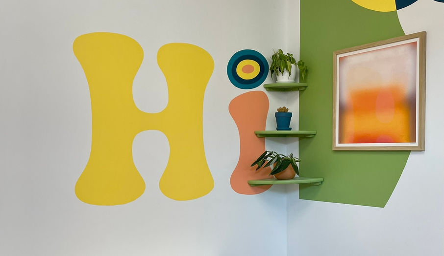This project was completed in the fall of 2025 prior to welcoming Hello, Hi to the Winooski circle. Working closely with the brand and design team, I conceptualized designs digitally before executing at large scale. The bright colors and retro themes make this mural stand out in Winooski and beyond!
